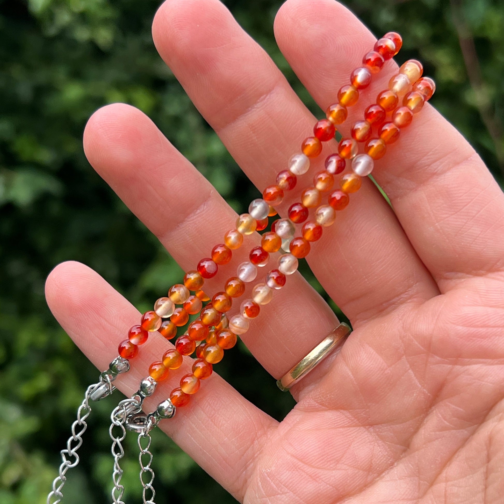 Karneol (thermisch behandelt) Fußkette, ist auch als Armband verwendbar. Die Perlen sind auf einer Schnur aufgefädelt. Die 5 cm Verlängerungskette ist aus Edelstahl.